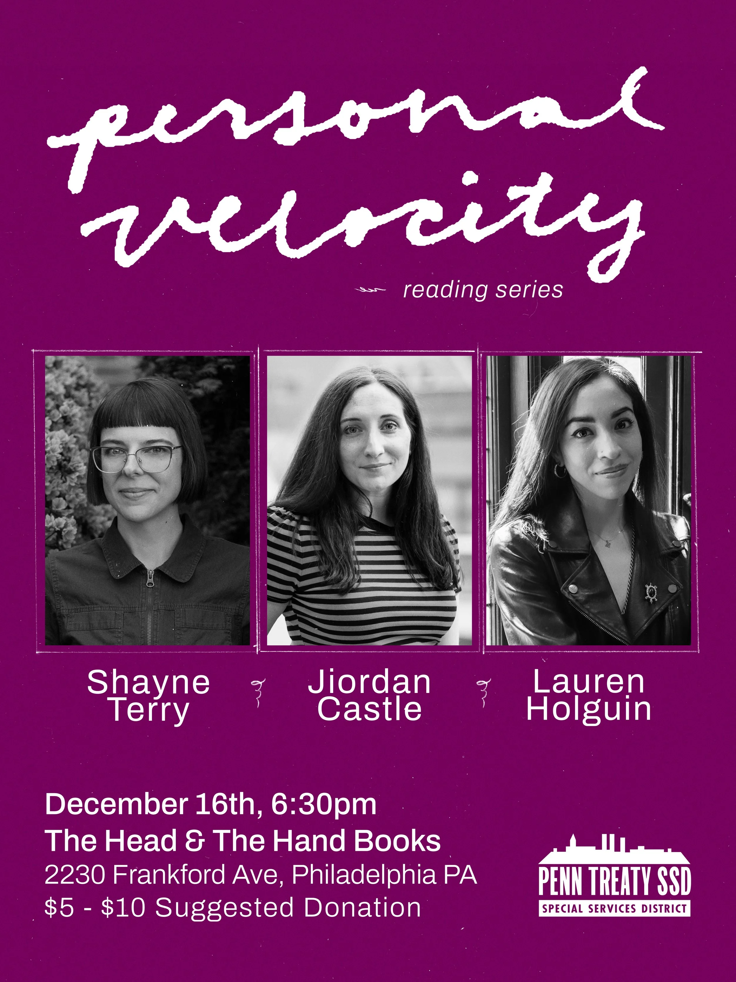 Organized by Katie Bennett, Personal Velocity is a monthly reading series featuring personal essays by women, nonbinary, and trans writers. The series will run every month from Aug '25 - Aug '26, thanks to a generous grant from Penn Treaty Special Services District.