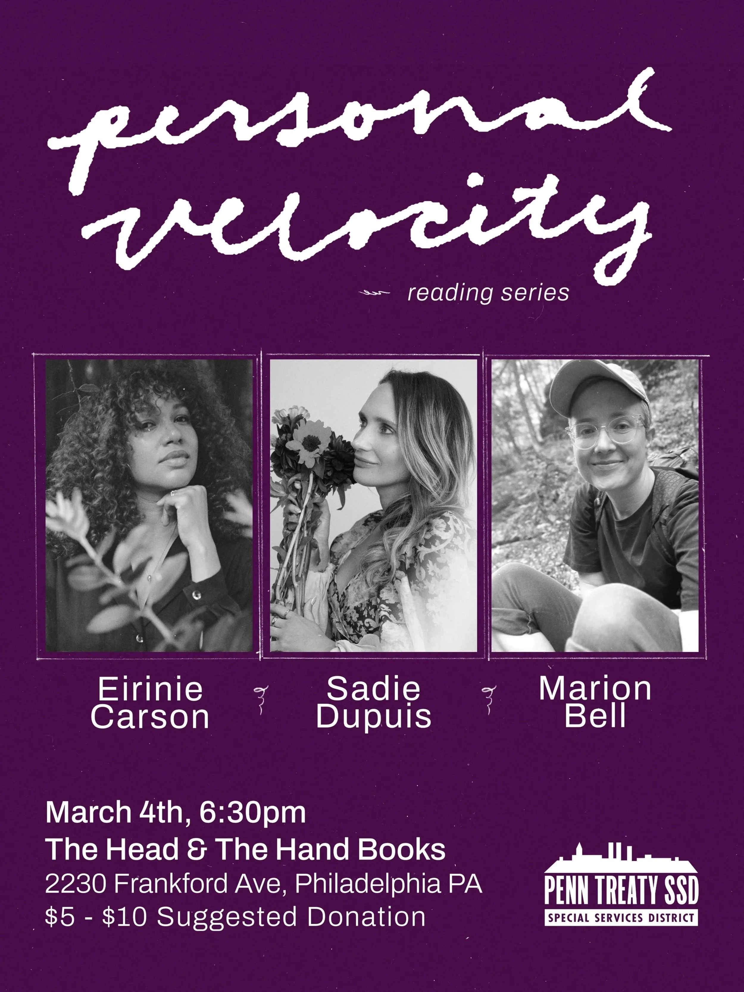 Organized by Katie Bennett, Personal Velocity is a monthly reading series featuring personal essays by women, nonbinary, and trans writers. The series will run every month from Aug '25 - Aug '26, thanks to a generous grant from Penn Treaty Special Services District.